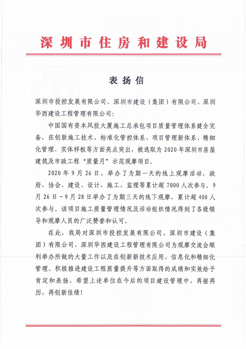 10月14日,深圳市建設(shè)(集團(tuán))有限公司收到來(lái)自深圳市住房和建設(shè)局的表?yè)P(yáng)信。 表?yè)P(yáng)信中,深圳市住房和建設(shè)局對(duì)建設(shè)集團(tuán)承建的中國(guó)國(guó)有資本風(fēng)投大廈施工總承包項(xiàng)目在2020年深圳市房屋建筑及市政工程“質(zhì)量月”觀摩交流會(huì)順利舉辦所做的大量工作以及在創(chuàng)新新技...